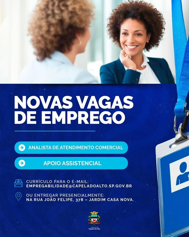 📧 Os interessados devem encaminhar o currículo para o e-mail: empregabilidade@capeladoalto.sp.gov.br