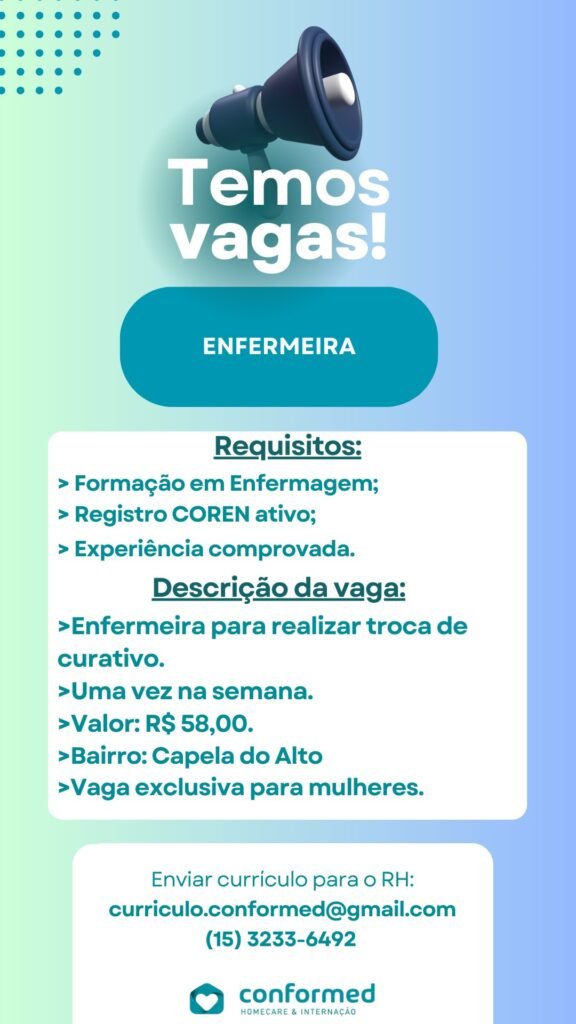 Estamos com uma vaga aberta para Capela do Alto para ENFERMEIRA.
