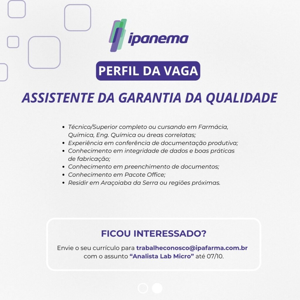 Envie seu currículo para trabalheconosco@ipafarma.com.br até dia 08/10 com o assunto “ Assistente GQ”