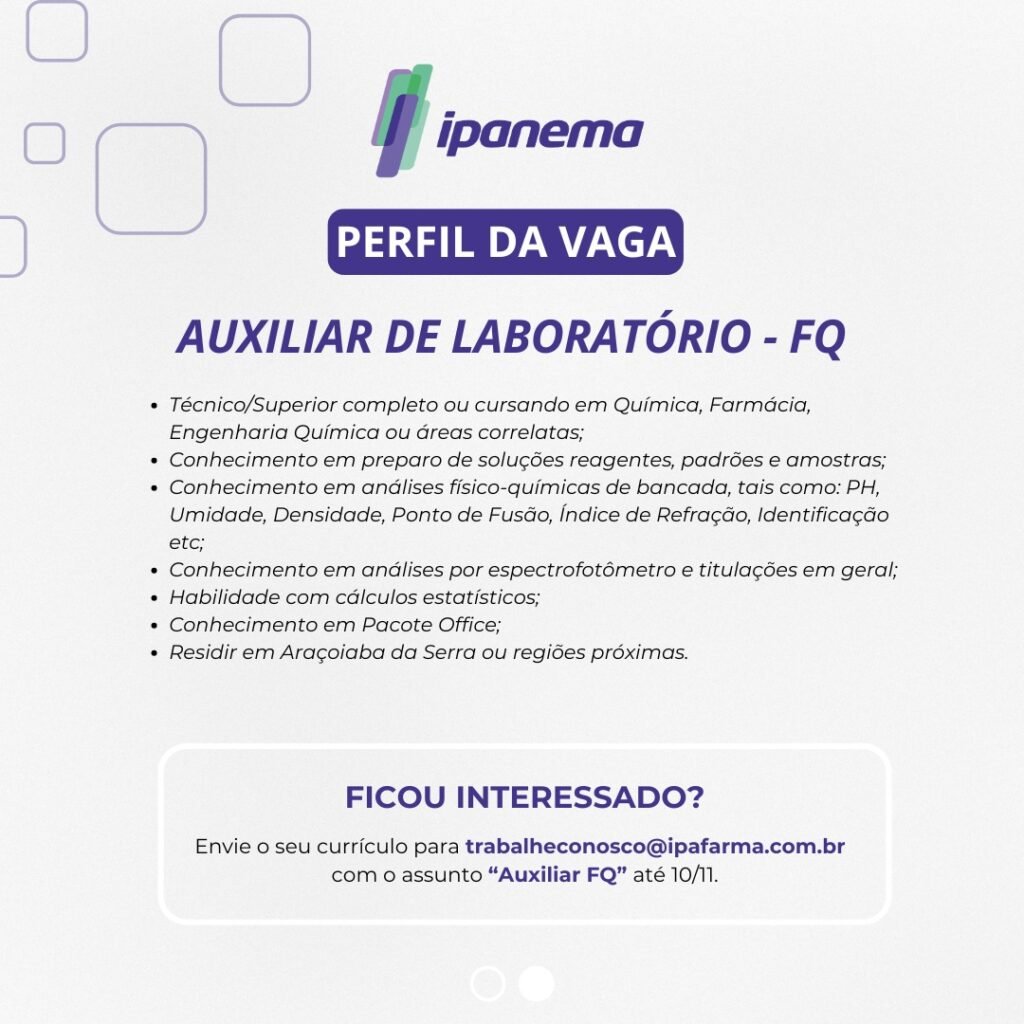 Envie seu currículo para trabalheconosco@ipafarma.com.br até dia 10/11 com o assunto “Auxiliar FQ”.