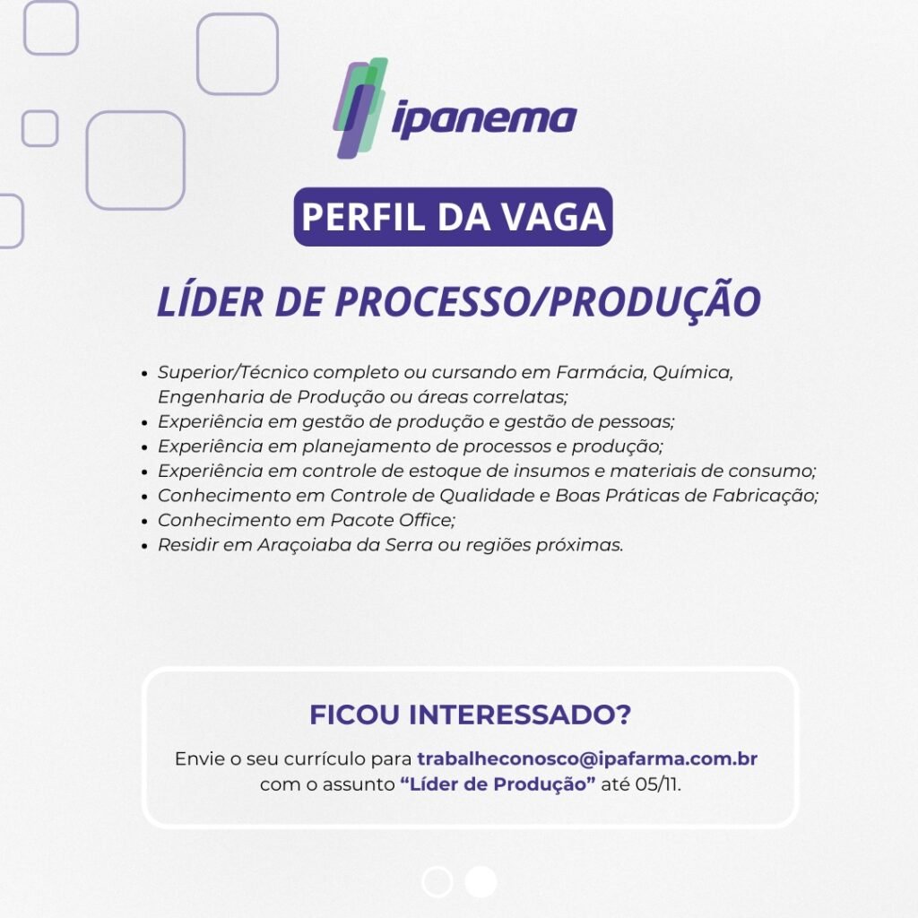 Envie seu currículo para trabalheconosco@ipafarma.com.br até dia 05/11 com o assunto “Líder de Produção”.