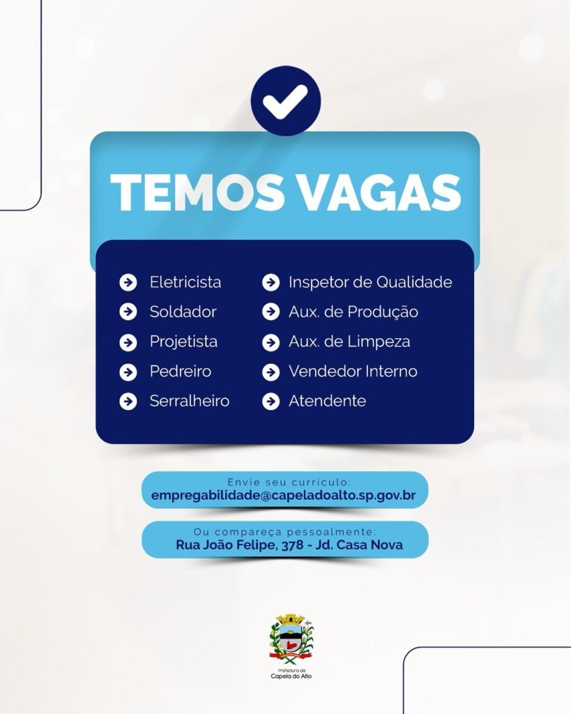 A Prefeitura de Capela do Alto, por meio do setor de Empregabilidade do Desenvolvimento Econômico, segue atuando como ponte entre empresas e trabalhadores, divulgando novas vagas de emprego disponíveis em nosso município. 🧾