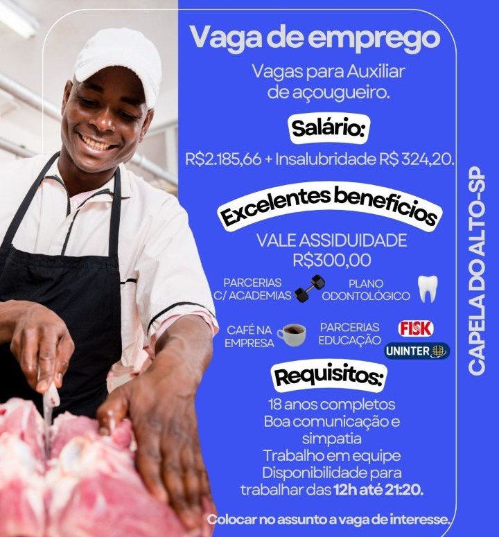 Envie seu curricolo: rh1@redesomar.com.br com o assunto “Auxiliar de Açougueiro”