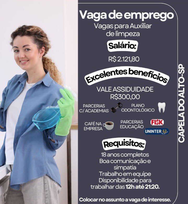 Envie seu curricolo: rh1@redesomar.com.br com o assunto “Auxiliar de Limpeza”